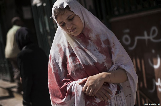 This photograph of a wounded woman leaving Dar El Shifa hospital was also taken in Aleppo by Spanish born Manu Brabo.